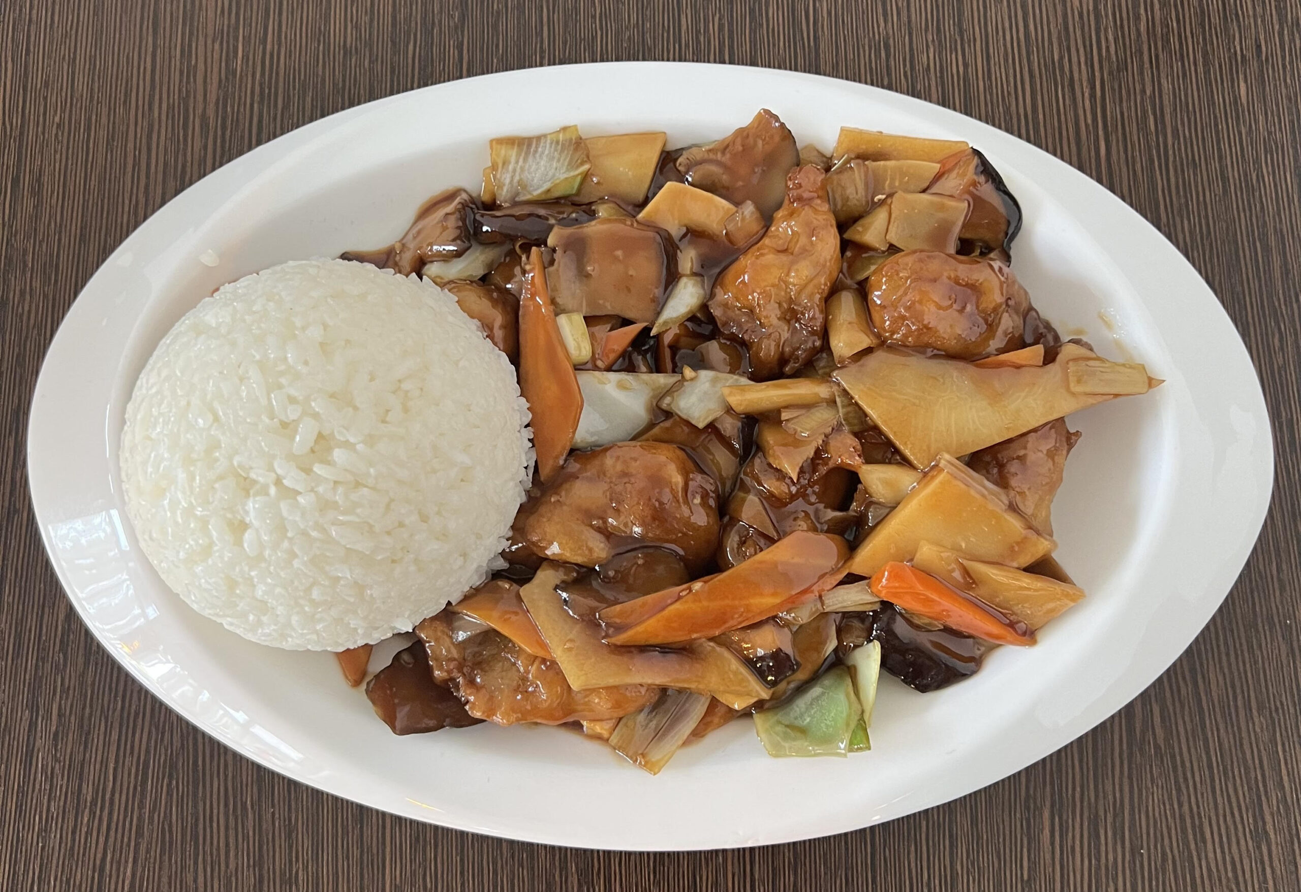 K6. Ribe z bambusom, gobami in rižem (kosilo vključuje kislo pekočo juho ali spomladanski zavitek )
